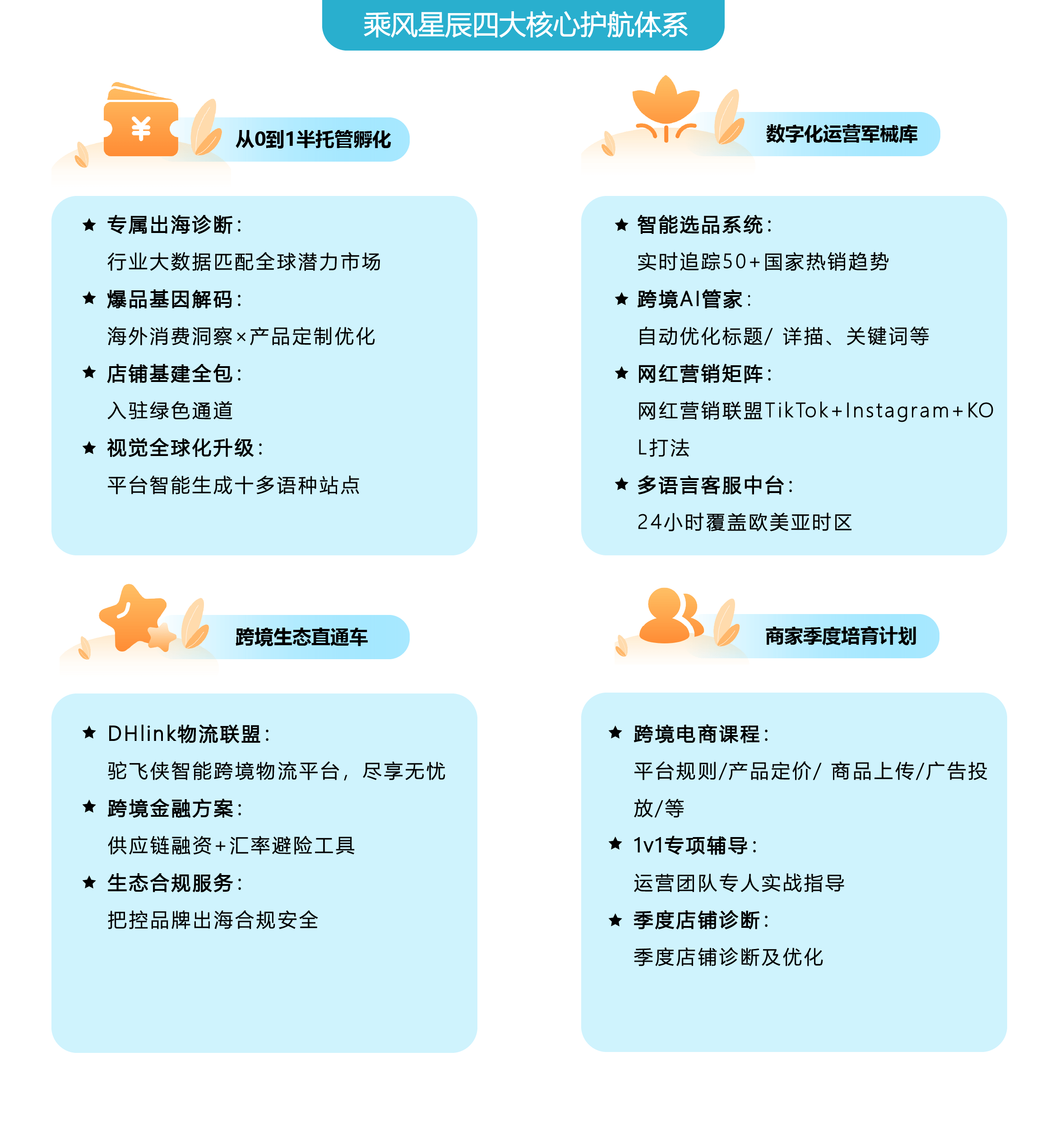 此刻,正是中国制造品牌出海的黄金窗口期,【乘风星辰】将以星辰大海的格局,引航中国优质商家扬帆全球蓝海——让世界爱上中国造!